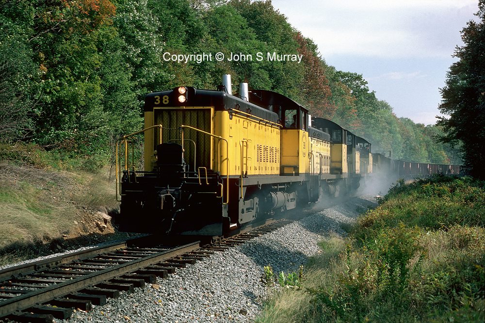Cambria & Indiana Railroad SW1200s 38, 37 & 2 lead 133 car coal train downgrade toward Conrail interchange Nanty Glo, Pa - 105905